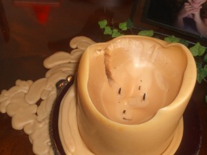 It obviously got very hot and very thin at that one spot, and the hot candle wax started flowing…all over the credenza. Fortunately, we had a glass top on the table, so the wood was saved, but I’m sad to say that the candle didn’t make it.